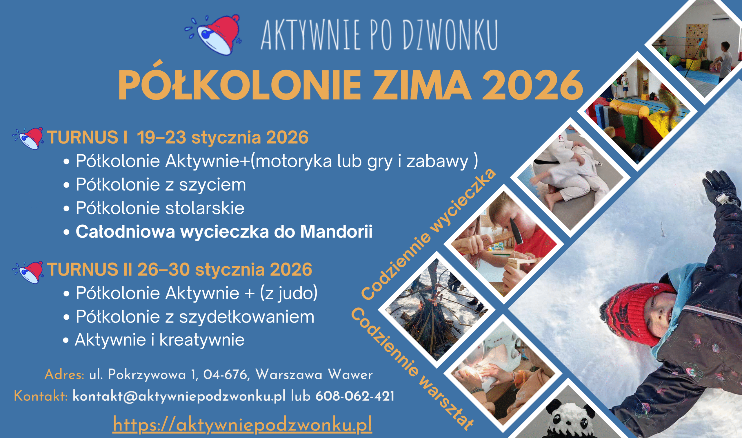 Zimowe Półkolonie 2026 w Aktywnie po Dzwonku! Ferie pełne atrakcji, wycieczek, kreatywności i wyjątkowej energii WOŚP, bo jak co roku jesteśmy Sztabem Zapraszamy dzieci 6–13 lat (starsze również mile widziane). Przy większej