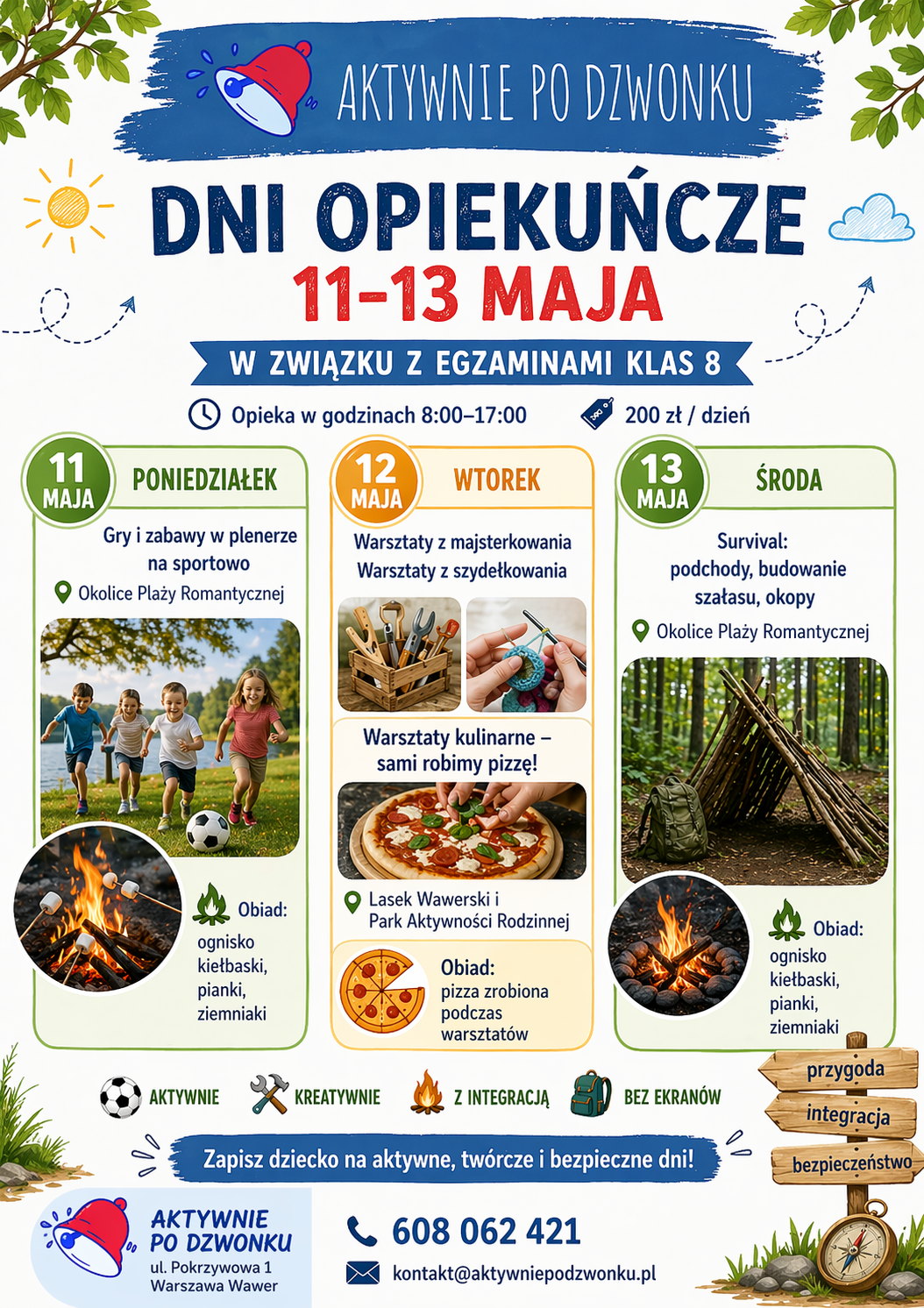 DNI OPIEKUŃCZE 11–13 MAJA(w związku z egzaminami klas)Szukasz ciekawego i bezpiecznego miejsca dla dziecka w czasie egzaminów?Zapraszamy do Aktywnie po dzwonku – przygotowaliśmy 3 dni pełne ruchu, przygody i kreatywnych zajęć.PROGRAM11 maja (poniedziałek)Gry